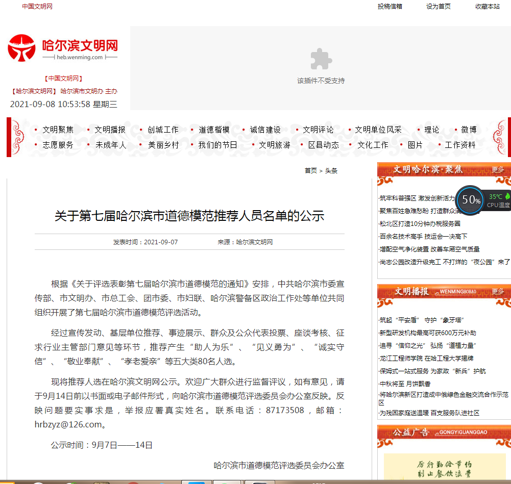 現將推薦人選在哈爾濱文明網公示。歡迎廣大群眾進行監督評議,如有意見,請于9月14日前以書面或電子郵件形式,向哈爾濱市道德模范評選委員會辦公室反映。反映問題要實事求是,舉報應署真實姓名。聯系電話:87173508,郵箱:hrbzyz@126.com。